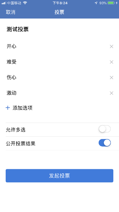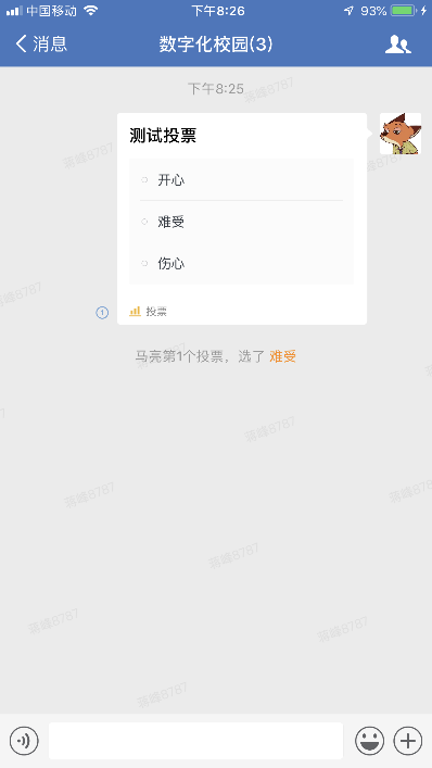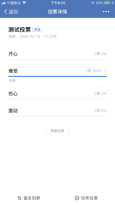 (5)“投票”:編輯投票信息,可單選、多選,發(fā)布到群消息中,群成員參與投票,界面如下: