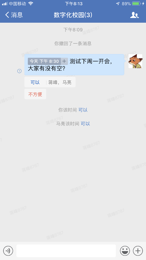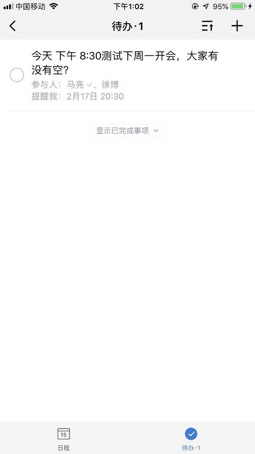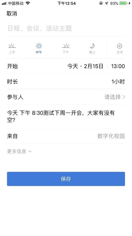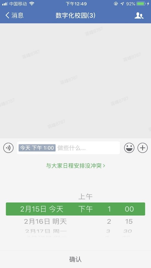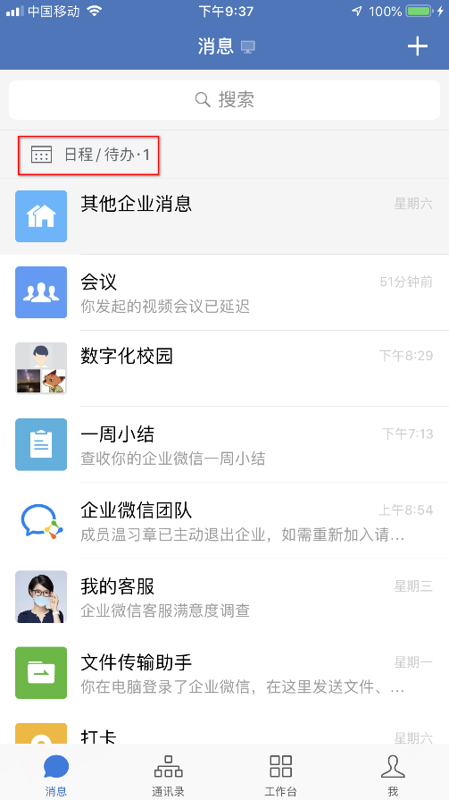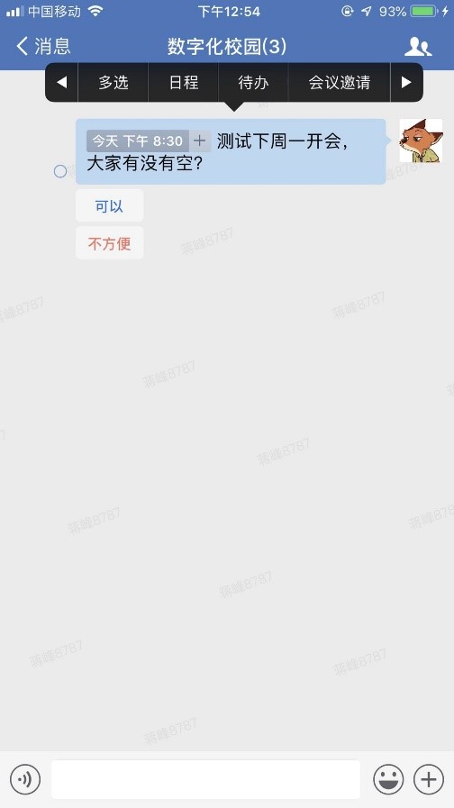 長按發(fā)布到群里的約時(shí)間的消息,會(huì)出現(xiàn)附加功能菜單,可選擇“日程”,保存到“日程/待辦”中,在消息界面可以查看,如下圖所示: