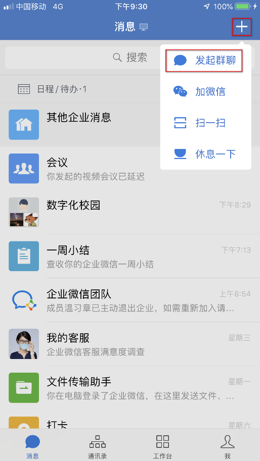 1、發(fā)起群聊,點(diǎn)擊右上角“+”,選擇“發(fā)起群聊”,