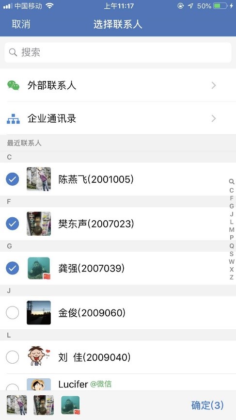 進(jìn)入選擇聯(lián)系人界面:選中想要加入群聊的人,也可以去企業(yè)通訊錄里選擇