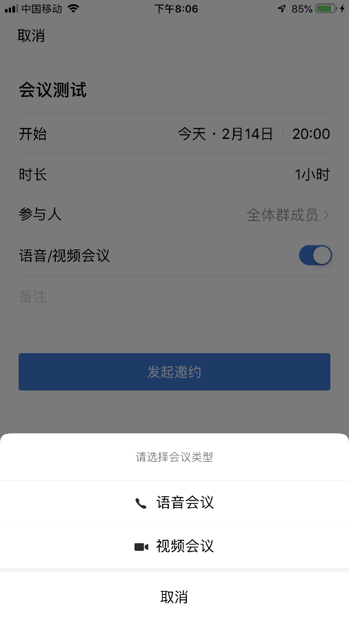 (2)“會(huì)議邀請”:填寫信息,可選擇語音會(huì)議或者視頻會(huì)議,發(fā)起邀約
