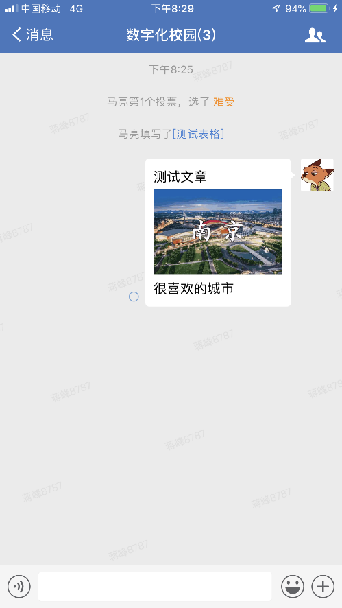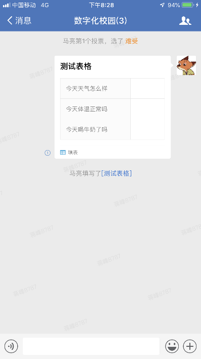 (6)“填表”:編輯表格信息,發(fā)布到群消息中,群成員參與填表統(tǒng)計(jì),點(diǎn)擊群消息中的表格消息,可查看填表詳情,可導(dǎo)出表格信息。界面如下: