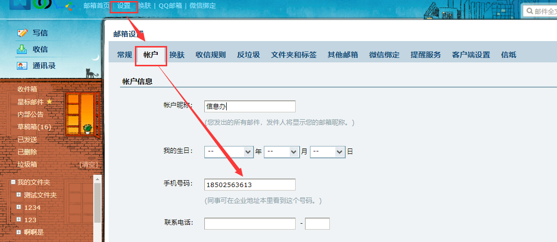 登錄郵箱后,通過“設(shè)置”-“帳戶”-“手機(jī)號碼”,填寫自己的手機(jī)號碼。