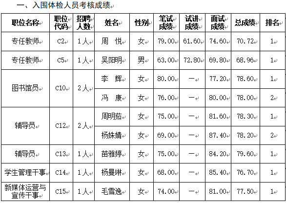 根據(jù)《南京交通職業(yè)技術(shù)學(xué)院2018年公開招聘工作人員(人事代理)公告》,經(jīng)筆試、試講(專任教師崗)、面試,按照綜合成績從高到低順序,以1:1的比例確定體檢人員名單,現(xiàn)將體檢名單及事項安排公告如下: