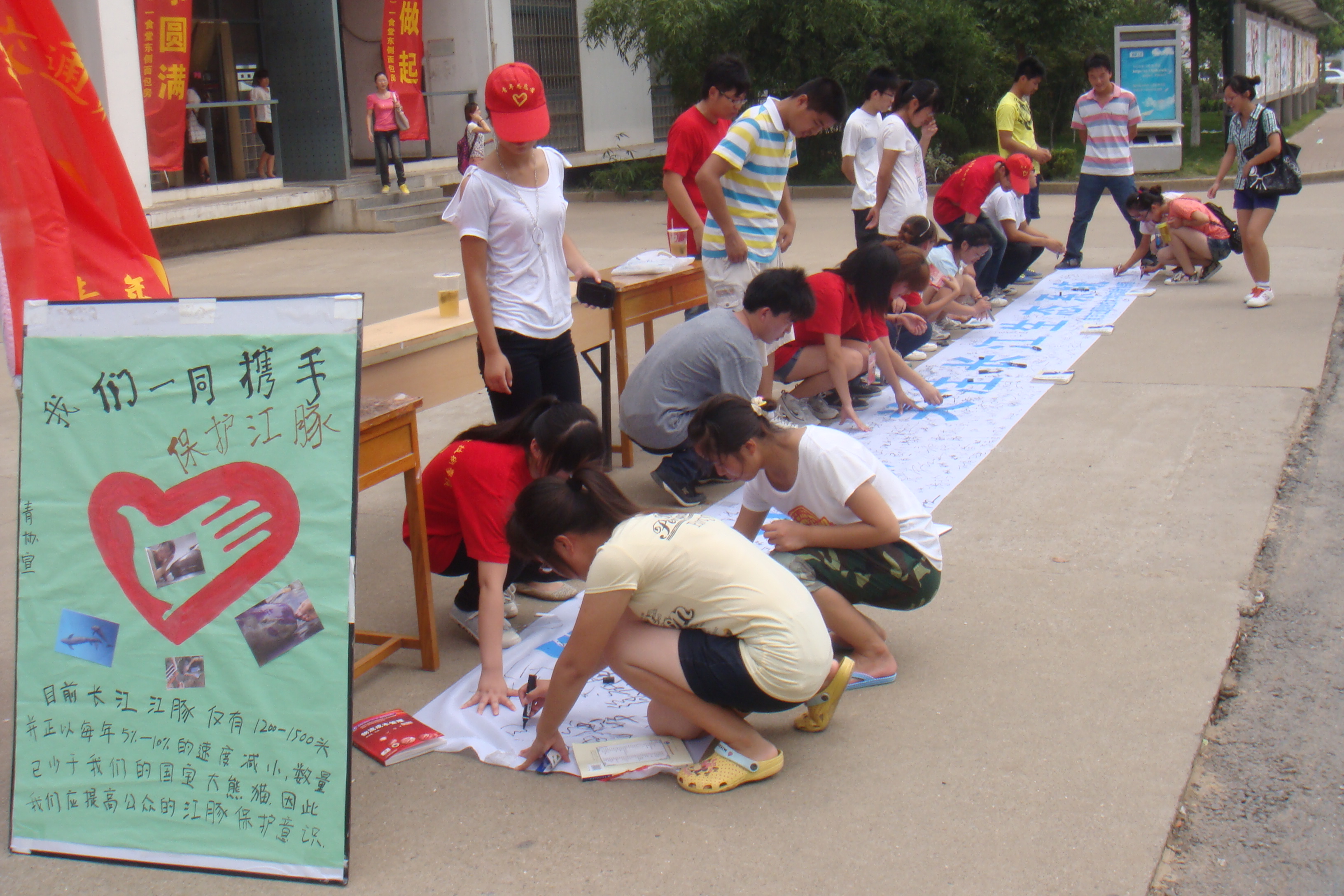 9月6號,一場由年志愿者協(xié)會主辦,以“生命應(yīng)存在而美麗,請留住江豚的微笑”為主題的保護(hù)江豚、千人簽名活動在我院第一食堂門口拉開帷幕。