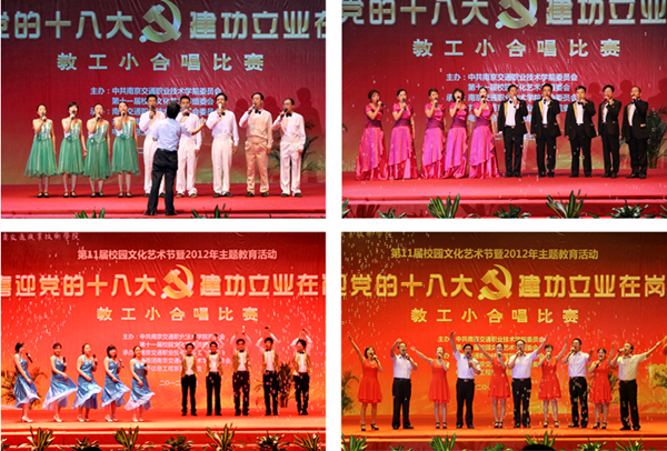 全院各黨總支及分工會共組織了十三支代表隊參賽,近130名教職工穿上精心準備的服裝,登臺獻唱。從激昂高亢的《團結就是力量》到舒緩輕柔的《南屏晚鐘》、從紅色經典《游擊隊之歌》到青春動感的《最炫民族風》,教職工們用優(yōu)美的歌聲表達深切的愛國之情和喜迎十八大勝利召開的喜悅振奮之情,充分展示了在學院二次創(chuàng)業(yè)征途中同心同德,朝氣蓬勃、協(xié)作進取的精神風貌。演出精彩紛呈,高潮迭起,掌聲不斷。
