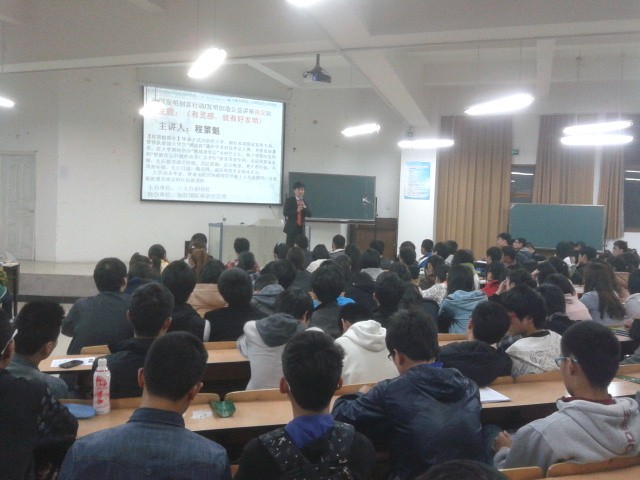 此次講座邀請(qǐng)了湖北省創(chuàng)新發(fā)明杰出青年程第魁為我們介紹發(fā)明創(chuàng)造的經(jīng)驗(yàn)。還在上大學(xué)的他為我們講述了自己的發(fā)明經(jīng)過,并為我們介紹發(fā)明創(chuàng)新的技法和心得?,F(xiàn)場(chǎng),程同學(xué)拿出一些大學(xué)生發(fā)明的新穎科技產(chǎn)品做道具,和我們一起分享創(chuàng)新的方法。這位年輕的演講者在演講中真正做到了:言之有理、言之有物、言之有情、言之有理。