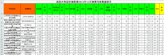 2015年下半年以來(lái),團(tuán)省委牽頭成立了高校共青團(tuán)微博聯(lián)盟,我院團(tuán)委和新媒體協(xié)會(huì)官方微博加入該聯(lián)盟。近日,根據(jù)團(tuán)省委發(fā)布的考核數(shù)據(jù),截止12月31日,我院新媒體協(xié)會(huì)微博綜合排名位列全省第二,其中博文量排名第一、本校粉絲數(shù)比例排名第三、閱讀量排名第二、最高閱讀量排名第三、傳播力排名第二。