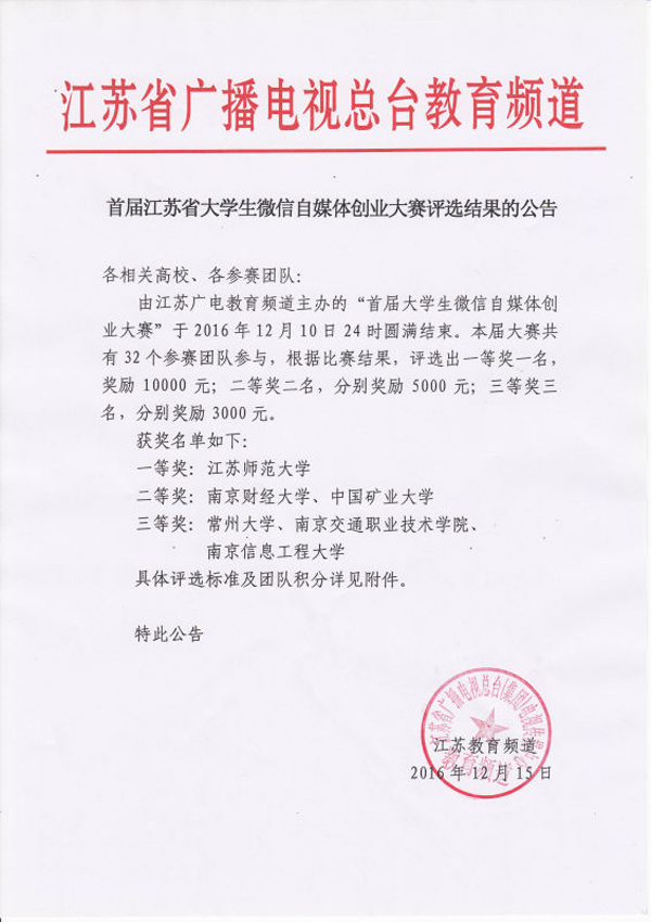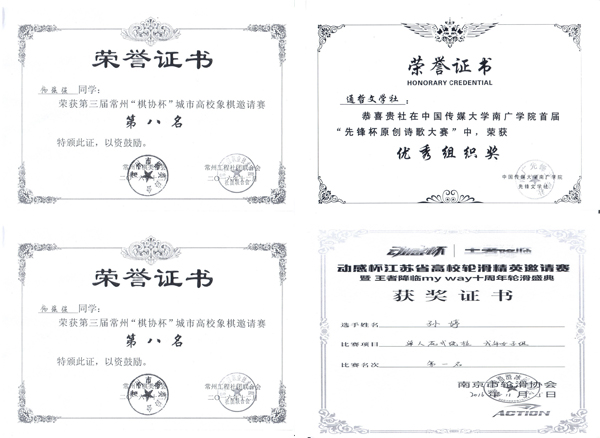 攝影協(xié)會選送的作品在江蘇省“最美校園”評比中獲得優(yōu)秀獎;翰軒棋社參加第三屆常州“棋協(xié)杯”城市高校象棋邀請賽,獲得團體第二名,1名同學(xué)獲得個人第八名;通哲文學(xué)社獲得南京十五高校中華經(jīng)典誦讀大賽優(yōu)秀獎,參加兄弟院校原創(chuàng)詩歌大賽獲得優(yōu)秀組織獎;新世紀(jì)足球社在江寧區(qū)高校足球賽中獲得第四名;新媒體協(xié)會在江蘇省廣播電視總臺教育頻道首屆大學(xué)生微信自媒體創(chuàng)業(yè)大賽中獲得三等獎;辯論與演講協(xié)會獲得“青春與夢想”南京市大學(xué)生演講比賽三等獎;輪滑社團參加省高校輪滑經(jīng)營邀請賽,包攬了單人花式繞樁女子組第一名、速度過樁女子組第一名、花式對抗女子組第一名。這些成績充分展示了社團建設(shè)發(fā)展和教師指導(dǎo)的成果。