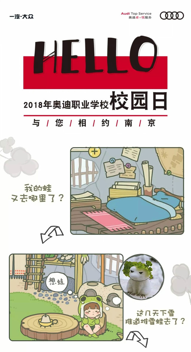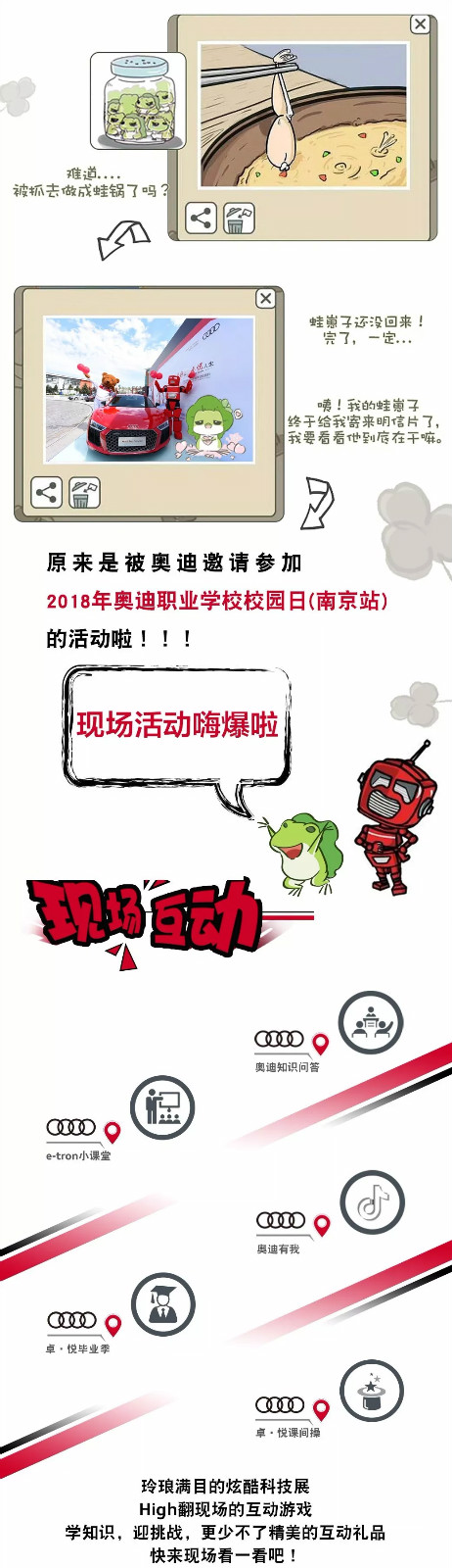 2018年奧迪職業(yè)學校校園日(南京站),玲瑯滿目的炫酷科技展,High翻現(xiàn)場的互動游戲,學知識,迎挑戰(zhàn),更少不了精美的互動禮品,2018年11月23日—24日,南京市江寧區(qū)龍眠大道629號南京交通職業(yè)技術(shù)學院,與您不見不散。