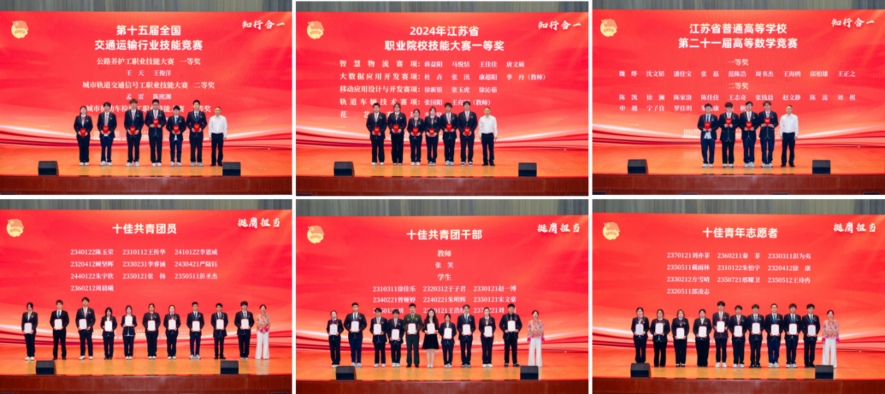 在五四表彰環(huán)節(jié),大會以“匠心筑夢”“知行合一”“挺膺擔(dān)當(dāng)”三個篇章展開,對過去一年在思想引領(lǐng)、技能競賽、社會實(shí)踐等領(lǐng)域表現(xiàn)突出的集體和個人進(jìn)行表彰。黨委書記張毅、院長王道峰等領(lǐng)導(dǎo)為獲獎代表頒獎?!拔逅募t旗分團(tuán)委”“江蘇省先進(jìn)班集體”“國家獎學(xué)金”等集體與個人榮譽(yù)表彰,彰顯組織建設(shè)與學(xué)業(yè)標(biāo)桿力量;全國交通運(yùn)輸行業(yè)技能大賽、中國國際大學(xué)生創(chuàng)新大賽、世界職業(yè)院校技能大賽等賽事獲獎代表上臺領(lǐng)獎,詮釋“技能成才、強(qiáng)國有我”的青春誓言;“十佳共青團(tuán)員”“十佳青年志愿者”“2024大學(xué)生年度人物”等榮譽(yù)獲得者,以行動踐行責(zé)任擔(dān)當(dāng),傳遞向善力量。