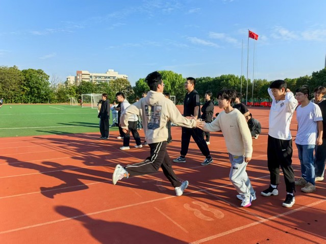 紅色田徑場上,“擊掌接力”率先點燃?xì)g樂的火種。同學(xué)們按照規(guī)則奔跑到終點再折返與隊友完成清脆擊掌——掌心相觸的瞬間,傳遞的不僅是接力的節(jié)奏,更是青春的默契與熱忱。場邊觀者或舉機(jī)定格靈動瞬間,或隨節(jié)奏輕拍掌心,暖陽灑在跑道上,將一張張盈滿笑意的臉龐映照得格外明亮。接力賽落幕,田徑場旁的空地即刻化作“蘿卜蹲”的歡樂天地?!鞍櫰そ范钻牰?、皺皮椒蹲隊蹲、皺皮椒蹲隊蹲完發(fā)際線總和我做隊蹲!”拗口的隊名讓口令流轉(zhuǎn)間滿是趣味,有隊員剛念完自家隊名,便被下一隊名絆住思緒,脫口說錯后笑彎了腰。