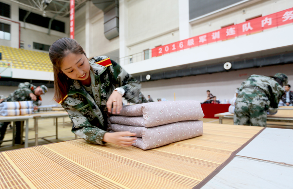 比賽過程中,同學(xué)們態(tài)度認(rèn)真,爭(zhēng)分奪秒,忙而不亂,按照教官的指導(dǎo),耐心細(xì)致得做好疊軍被的每一步,雖然選手們采用的方法不同,但經(jīng)過認(rèn)真整理,最終呈現(xiàn)了整潔美觀的軍被。