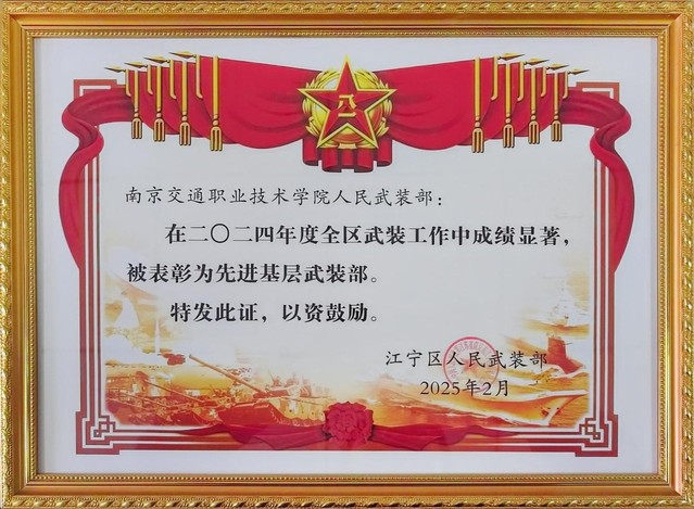 近日,南京市江寧區(qū)人民武裝部對(duì)2024年度全區(qū)武裝工作先進(jìn)單位和個(gè)人進(jìn)行了表彰,我院武裝部被評(píng)為“先進(jìn)基層武裝部”,也是全區(qū)獲此殊榮的5家單位中唯一一所院校武裝部。