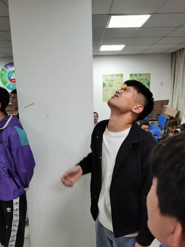 第三個環(huán)節(jié)由四個小環(huán)節(jié)組成,各部門派兩對搭檔登場,第一位以捏鼻俯身伸手的姿勢原地轉(zhuǎn)十圈,第二位同學(xué)將桌子上的一排氣球吹滿氣,第三位完成五個呼啦圈,最后一位同學(xué)吃餅干,采用接力制,用時最短的一組獲勝??瓷先コ燥灨伤坪跏亲詈唵蔚囊粋€環(huán)節(jié),但想要快速的將難以咀嚼的餅干吃完,卻也不是件容易的事情。而第一步轉(zhuǎn)圈圈的同學(xué),有些直接轉(zhuǎn)到暈頭轉(zhuǎn)向,已經(jīng)遠遠超出了十圈而不自知,最后被其他隊員扶下了場。同學(xué)們?yōu)榱瞬块T的榮譽,也是夠拼的。
