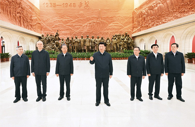 2022年10月27日,中共中央總書(shū)記、國(guó)家主席、中央軍委主席習(xí)近平帶領(lǐng)中共中央政治局常委李強(qiáng)、趙樂(lè)際、王滬寧、蔡奇、丁薛祥、李希,瞻仰延安革命紀(jì)念地。這是習(xí)近平在延安革命紀(jì)念館參觀《偉大歷程——中共中央在延安十三年歷史陳列》結(jié)束時(shí)發(fā)表重要講話。 新華社記者 燕雁/攝