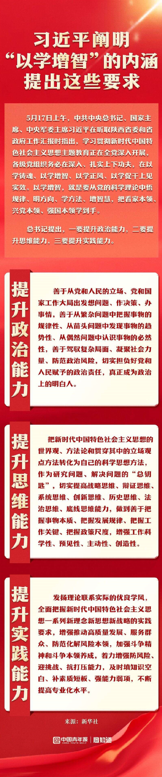 5月17日上午,中共中央總書記、國家主席、中央軍委主席習近平在聽取陜西省委和省政府工作匯報時指出,學習貫徹新時代中國特色社會主義思想主題教育正在全黨深入開展,各級黨組織務必在深入、扎實上下功夫,在以學鑄魂、以學增智、以學正風、以學促干上見實效。以學增智,就是要從黨的科學理論中悟規(guī)律、明方向、學方法、增智慧,把看家本領、興黨本領、強國本領學到手??磮D學習如何做到“以學增智”。