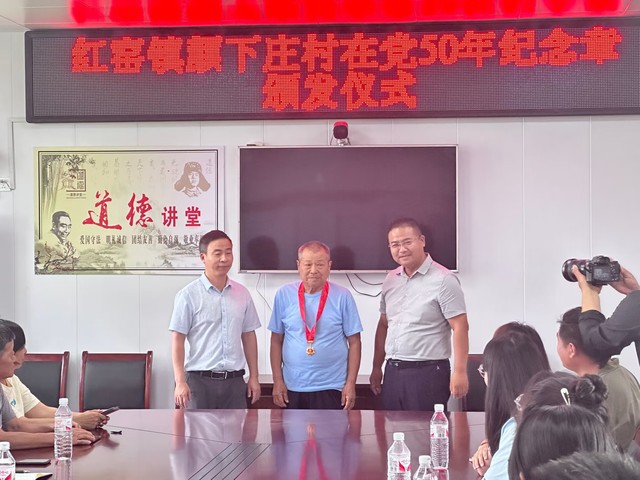 在中國共產黨建黨102周年華誕來臨之際,人文藝術系“研學筑夢,一路生花”鄉(xiāng)村振興實踐團的師生們有幸見證了顏下莊村“光榮在黨50年”紀念章頒發(fā)的光榮時刻?!肮鈽s在黨50年”紀念章,凝聚著黨和人民對老黨員的感激之情,承載著老黨員的光榮與擔當,既是對黨員不忘初心的詮釋,也是對黨員增強“四個意識”、堅定“四個自信”,做到“兩個維護”的有力鞭策。在場的師生們無不深受感觸,紛紛表示在黨50年,風雨50載,從滿頭青絲到銀發(fā)生輝,老去的是歲月,不變的是對黨的忠誠。而作為新時代的中國青年,要學習老黨員前輩們“一顆紅心永向黨”的政治品格、“以身示范敢為人先”的擔當魄力和“擼起袖子加油干”的奮斗精神,繼承和發(fā)揚老黨員的愛黨愛國之情與踏實奮斗的歷史積淀,把初心和使命銘記于心、踐之于行!