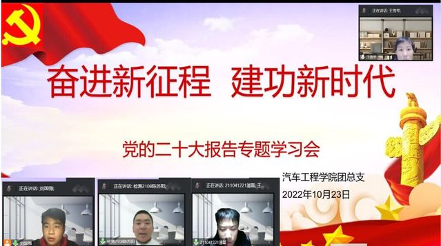 為深入學(xué)習(xí)貫徹落實中國共產(chǎn)黨第二十次全國代表大會精神,10月23日晚,汽車工程學(xué)院團總支在線組織開展了以“奮進(jìn)新征程 建功新時代”為主題的黨的二十大工作報告學(xué)習(xí)會。學(xué)生會干部、各班級班長和團支部書記100余人參加了學(xué)習(xí)會。會議由團總支書記王雪琴主持。