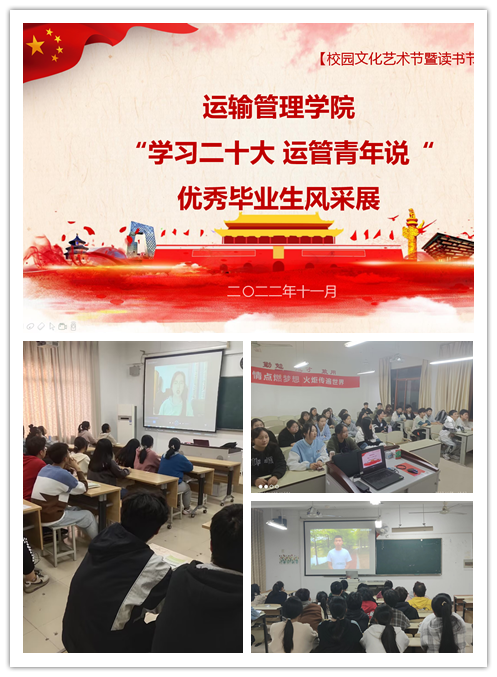 “青年興則國家興,青年強(qiáng)則國家強(qiáng)”,為了讓同學(xué)們更加深刻領(lǐng)會(huì)習(xí)近平總書記對(duì)中國當(dāng)代大學(xué)生的殷切期望,勇?lián)聲r(shí)代使命,運(yùn)輸管理學(xué)院于11月開展了“學(xué)習(xí)二十大,運(yùn)管青年說”優(yōu)秀畢業(yè)生風(fēng)采展活動(dòng)。本次活動(dòng)邀請(qǐng)了9名優(yōu)秀畢業(yè)生,以視頻的方式向全體2022級(jí)學(xué)生展現(xiàn)運(yùn)輸管理學(xué)院學(xué)子的風(fēng)采。