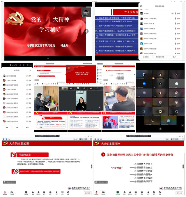 因疫情原因,本次班會活動線上展開。班主任、第二班主任老師通過PPT展演、視頻播放、學(xué)生宣講、分組討論等生動活潑的形式吸引了廣大同學(xué)積極參與;班會內(nèi)容重點圍繞“黨的二十大的主題”、“新時代新征程中國共產(chǎn)黨的使命任務(wù)”、“中國式現(xiàn)代化的中國特色和本質(zhì)要求”、“教育科技人才、法治建設(shè)、國家安全等方面的重大部署”等方面的內(nèi)容展開,由第二班主任對二十大報告精神進行傳達學(xué)習(xí),班主任則引導(dǎo)學(xué)生圍繞青年、教育、創(chuàng)新等相關(guān)內(nèi)容闡述分享自己的感悟,畢業(yè)班班主任引導(dǎo)學(xué)生結(jié)合實習(xí)期間的經(jīng)歷進行了交流。