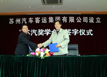 蘇州汽車客運集團有限公司是我省乃至全國汽車客運行業(yè)的重點企業(yè),與我院保持著良好的長期合作關系,現(xiàn)有員工中我院畢業(yè)生超過100人。該公司計劃今年從我院錄用30名汽車、財會和物流管理專業(yè)畢業(yè)生。為發(fā)揮公司品牌的影響力,吸引我院汽車專業(yè)優(yōu)秀學生到公司工作,公司將從2008年起連續(xù)三年在我院設立“蘇汽獎學金”,每年2萬元,用于獎勵汽車專業(yè)品學兼優(yōu)的學生。