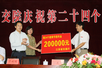 省交通廳廳長(zhǎng)游慶仲代表省交通廳向?qū)W院全體教職員工表示節(jié)日的問(wèn)候和良好的祝愿并頒發(fā)了教師節(jié)慰問(wèn)金。游廳長(zhǎng)詳細(xì)介紹了江蘇交通近年來(lái)建設(shè)發(fā)展所取得的輝煌成就,闡述了人才培養(yǎng)在推進(jìn)江蘇交通發(fā)展中的重要意義。游廳長(zhǎng)指出,在構(gòu)建綜合交通運(yùn)輸體系的新形勢(shì)下,交通要發(fā)揮好先行官的作用,任務(wù)非常艱巨,我們首先要按照科學(xué)發(fā)展觀的要求,把“好”字?jǐn)[在最突出的位置,不僅要“好”,而且要有一定的速度,因此還需要大量的人才來(lái)支撐交通的發(fā)展。