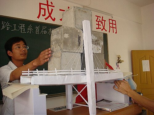 獲得本次競賽一等獎的是07232班周浩等同學(xué)創(chuàng)作的“友誼大橋”及07214班林建勇等同學(xué)創(chuàng)作的“長江一號橋”,其中“友誼大橋”以自重0.66kg,最大承載力51kg兼獲最優(yōu)承載力獎。此次競賽的橋梁的制作材料僅為普通A4復(fù)印紙及膠水、裝訂線,要求各隊選手在最少材料下取得最佳承載效果。