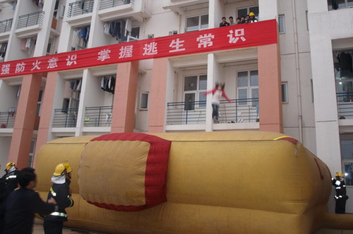 14時20分,院黨委副書記、活動總指揮許正林宣布消防演練開始,只見學(xué)生公寓F座北樓316宿舍冒出滾滾濃煙,與此同時,配合模擬演練的廣播響起,向在場圍觀的師生播報演練進(jìn)程和消防安全知識。同學(xué)們在疏散組老師的指揮下,手拿著毛巾或者手絹捂著口鼻按預(yù)定疏散路線有序地進(jìn)行疏散。在模擬現(xiàn)場,6名學(xué)生自己通過救生繩從2樓宿舍陽臺降到地面,此時,醫(yī)護(hù)人員將受傷學(xué)生用擔(dān)架抬出,并進(jìn)行搶救。正當(dāng)模擬現(xiàn)場火勢蔓延之際,消防車在校園110的引導(dǎo)下趕到“火災(zāi)”現(xiàn)場,消防員迅速開展行動,待消防救生氣墊準(zhǔn)備就緒后,6名被困學(xué)生在消防員的引導(dǎo)下從陽臺跳到消防救生氣墊上,安全獲救。隨即“火勢”也被成功控制。雖然當(dāng)時下著雨,但演練現(xiàn)場依然節(jié)奏緊湊、秩序井然,短短22分鐘,逃生自救疏散演練圓滿完成。