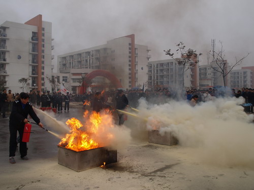 在消防演練最后階段,學(xué)院義務(wù)消防隊員、宿舍管理員在消防員的指導(dǎo)下也進(jìn)行了初起火災(zāi)撲救演練。