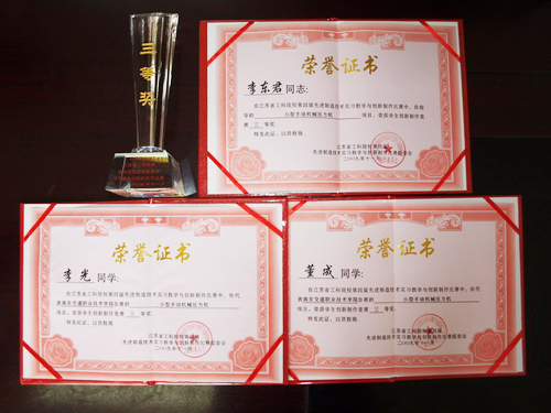 近日,江蘇省工科院校第四屆先進(jìn)制造技術(shù)實(shí)習(xí)教學(xué)與創(chuàng)新制作比賽組委會(huì)傳來喜訊:首次參賽的學(xué)院機(jī)電工程系李光和董成兩位同學(xué)設(shè)計(jì)制作的“小型手動(dòng)機(jī)械壓力機(jī)”獲得學(xué)生創(chuàng)新制作競(jìng)賽三等獎(jiǎng),指導(dǎo)老師李東君獲得學(xué)生創(chuàng)新制作競(jìng)賽優(yōu)秀指導(dǎo)教師獎(jiǎng)。