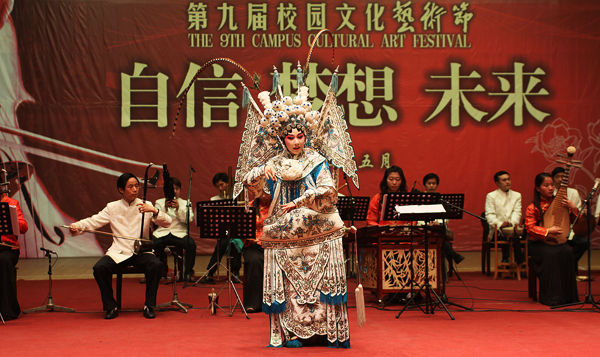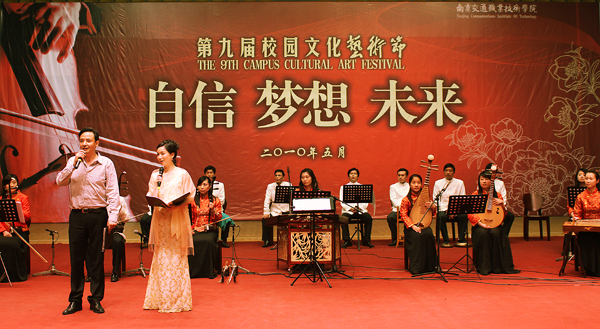 演出由國(guó)家一級(jí)演員、影視劇三棲明星侯長(zhǎng)榮先生,國(guó)家一級(jí)演員諸葛秀蘭主持并講析,共演繹了八個(gè)富有特色的節(jié)目。民樂(lè)合奏《揚(yáng)州好》、《揚(yáng)劇曲牌曲目協(xié)奏》,揚(yáng)劇花鼓調(diào)聯(lián)唱《俏人兒》、《十杯酒》、《采蓮調(diào)》,經(jīng)典揚(yáng)劇《百歲掛帥•壽堂》等相繼登臺(tái),聯(lián)袂上演了一場(chǎng)揚(yáng)劇盛宴。由藝術(shù)家?guī)ьI(lǐng)同學(xué)互動(dòng)模仿的揚(yáng)劇秀,給現(xiàn)場(chǎng)平添了幾分喜劇效果。演出給觀眾帶來(lái)精美藝術(shù)鑒賞的同時(shí),也為本次校園文化藝術(shù)節(jié)傳統(tǒng)文化系列節(jié)目畫(huà)上了濃墨重彩的一筆。