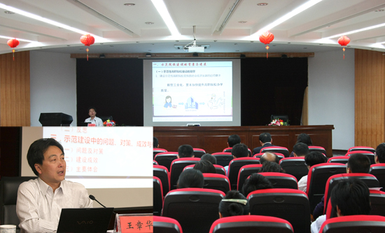 王教授講座的主題是“以示范性院校建設(shè)引領(lǐng)高等職業(yè)教育的改革發(fā)展”。他分別從示范性院校建設(shè)的背景與進(jìn)展、示范性院校申報(bào)的收獲與反思、示范性院校建設(shè)中的問題、對(duì)策與體會(huì)以及幾點(diǎn)思考等四個(gè)方面,緊密結(jié)合湖南交通職業(yè)技術(shù)學(xué)院在國(guó)家示范性高職院建設(shè)中的具體實(shí)踐、寶貴經(jīng)驗(yàn)及深刻反思,以現(xiàn)身說法的形式,對(duì)高職院校在示范創(chuàng)建過程中如何得到提升、創(chuàng)新和發(fā)展,如何解決在具體改革、探索過程中面臨的各種困難,如何探索走出一條具有中國(guó)特色的高等職業(yè)教育新路,如何打造交通職業(yè)教育的品牌等方面進(jìn)行了詳細(xì)介紹和精辟論述,并結(jié)合即將面臨生源下降的形勢(shì),就如何保證高職教育持續(xù)發(fā)展提出了自己的思考和見解。