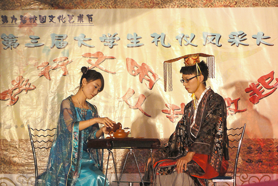 比賽分為個人風(fēng)采展示、傳統(tǒng)禮儀展示、禮儀知識問答三個部分,選手們從容的舉止、高雅的風(fēng)度、智慧的回答博得了在場觀眾陣陣掌聲。在傳統(tǒng)禮儀展示環(huán)節(jié)中,七個系的選手精彩演繹了秦漢、魏晉、隋唐、宋朝、元朝、明朝、清朝等朝代的傳統(tǒng)禮儀。