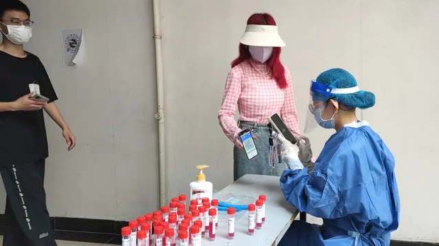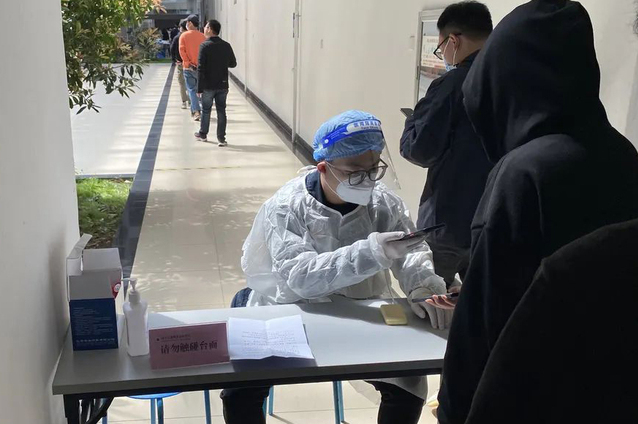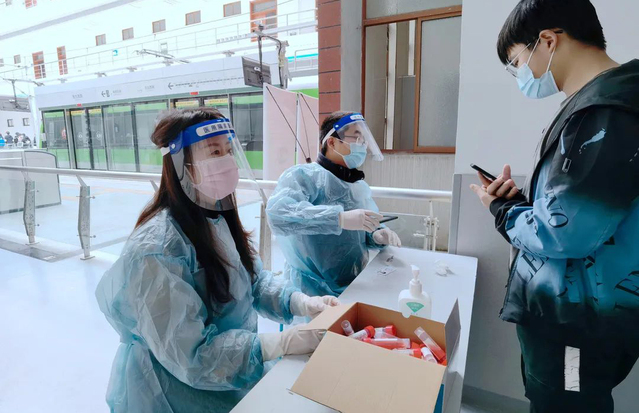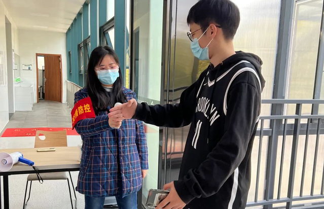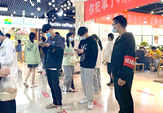 作為一名黨員志愿者,她負(fù)責(zé)全員核酸檢測(cè)掃碼、維護(hù)現(xiàn)場(chǎng)秩序、及時(shí)收集學(xué)生的核酸檢測(cè)結(jié)果等各項(xiàng)工作,午飯時(shí)間,她作為食堂黨員志愿者引導(dǎo)學(xué)生測(cè)體溫并提醒學(xué)生戴口罩、按照一米線距離排隊(duì)等。