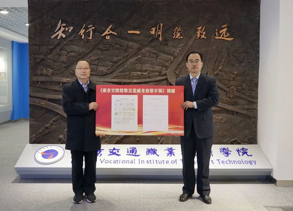 大會當天,校友萬江波向學院捐贈了由著名作曲家沈亞威作曲的《南京交通學校校歌》手稿。萬江波老師根據(jù)校歌創(chuàng)作過程,撰寫了《覆蓋在歌譜里的即時貼》文章,刊發(fā)在《南京日報》。學院副院長謝劍康,黨委委員、組織部部長康建軍,黨委委員、宣傳部部長袁茜參加捐贈儀式。