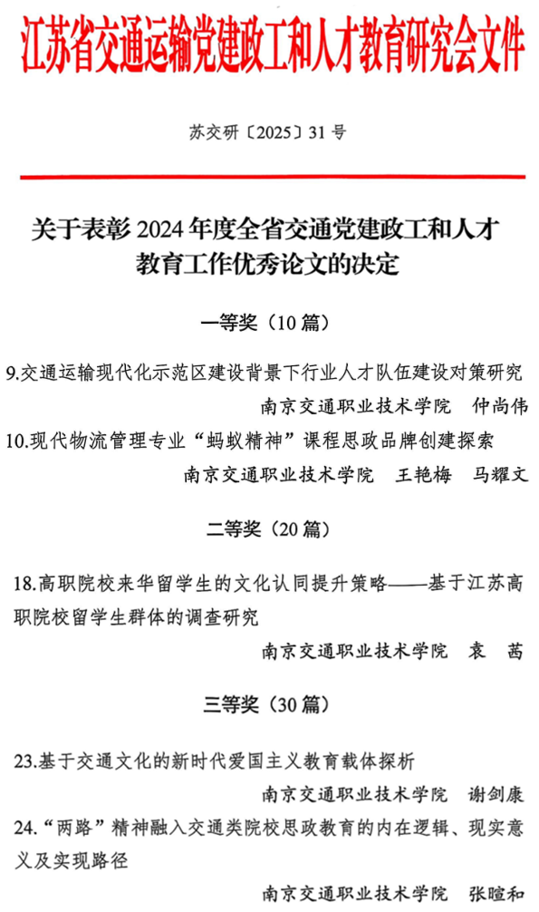 近日,省交通運輸黨建政工和人才教育研究會表彰了2024年度全省交通黨建政工和人才教育工作優(yōu)秀論文,學(xué)院5篇論文獲獎。