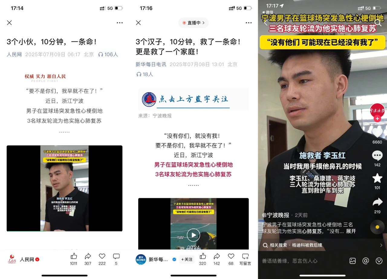 621日晚上,李玉紅約上好友來到浙江省慈溪市長(zhǎng)河鎮(zhèn)墊橋村文化禮堂旁的籃球場(chǎng)打球。21點(diǎn)40分,籃球場(chǎng)內(nèi)一名球員楊迪科突然暈厥倒地,現(xiàn)場(chǎng)人員慌亂無措。在場(chǎng)打球的李玉紅迅速?zèng)_上前,在判斷對(duì)方無意識(shí)、無呼吸后,憑借在軍隊(duì)時(shí)接受的急救培訓(xùn)經(jīng)驗(yàn),迅速做出判斷:他一邊大聲呼喊旁邊的好友撥打120急救電話,一邊轉(zhuǎn)頭將楊迪科口中的異物清除,開始為他實(shí)施心肺復(fù)蘇。
