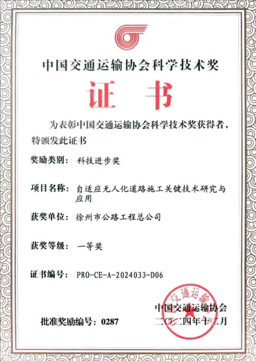 近日,2024年度中國交通運(yùn)輸協(xié)會科學(xué)技術(shù)獎獲獎名單公布,徐州市公路工程總公司“自適應(yīng)無人化道路施工關(guān)鍵技術(shù)研究與應(yīng)用”項目榮獲科技進(jìn)步獎一等獎。